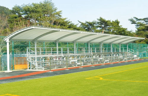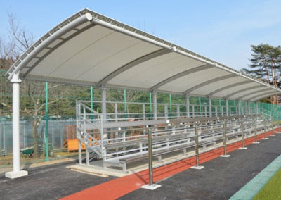 ルイ・ステージ30人掛けを覆うことのできる大型シェルターです。 屋根材は不燃材を使用、UVカットで真夏の直射日光をさえぎります。メーカー名:ルイ高スポーツと社会との関わりを考える上で、「品質」・「安全」・「環境」の3つのテーマを掲げ、製品開発に取り組んでいます。また、軽量で安全、環境負荷の少ないアルミ製品を積極的に採用しています。