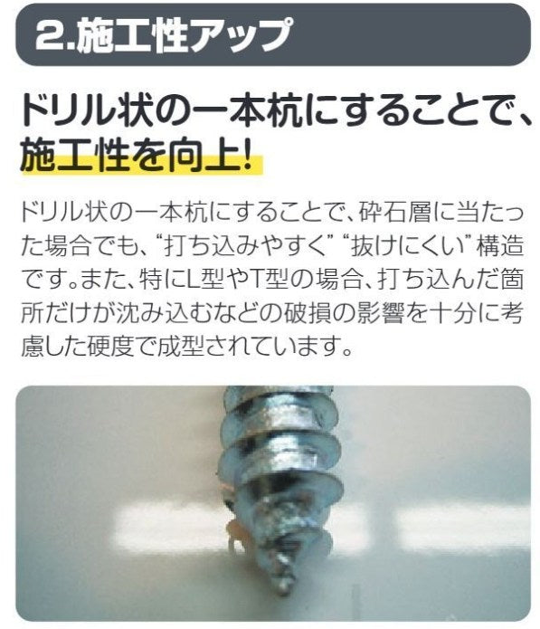 表面のスリットがスベリを抑え、安全性が向上し、ドリル状の1本杭は打ちこみやすく抜けにくい構造です。メーカー名:ルイ高