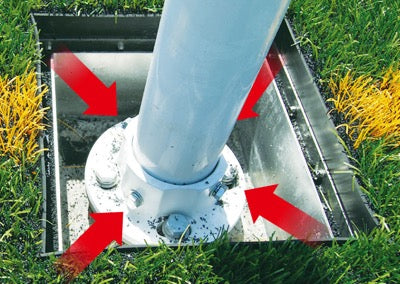 ●アルミ合金製、アルマイト処理後電着塗装(一部焼付塗装)●ポストφ100/クロスバーφ85mm●GL下ヒンジ式●1/2対115kg