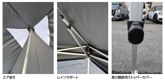 天幕の垂れ幕部分の裏側には、マジックテープが付いているので、別売の横幕や案内幕などを簡単に取り付けることもできます。